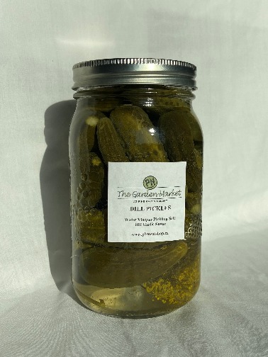 A quart jar of preserved sweet pickles from our garden. Ready to use. Crunchy, and delightfully sour.