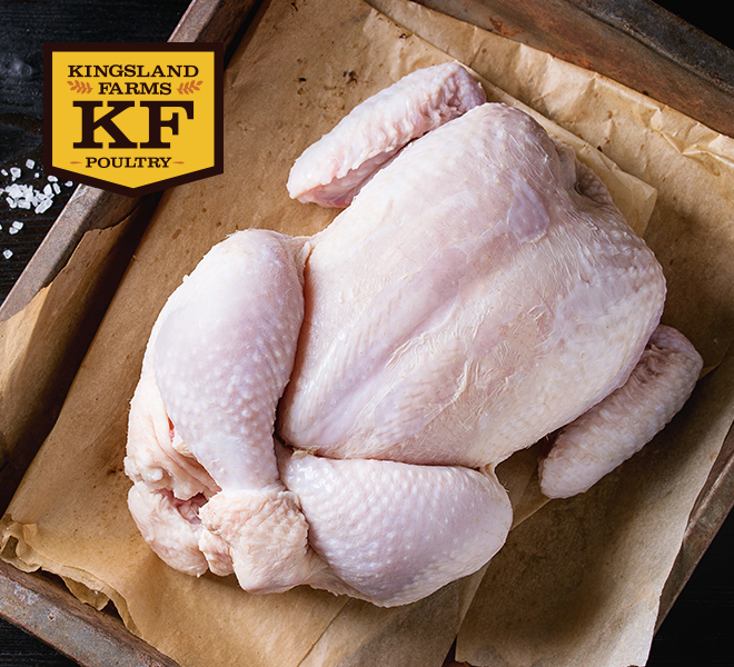 Kingsland Farms Roasting Chicken. Farm-raised free range inside straw-bedded and temperature-controlled housing.